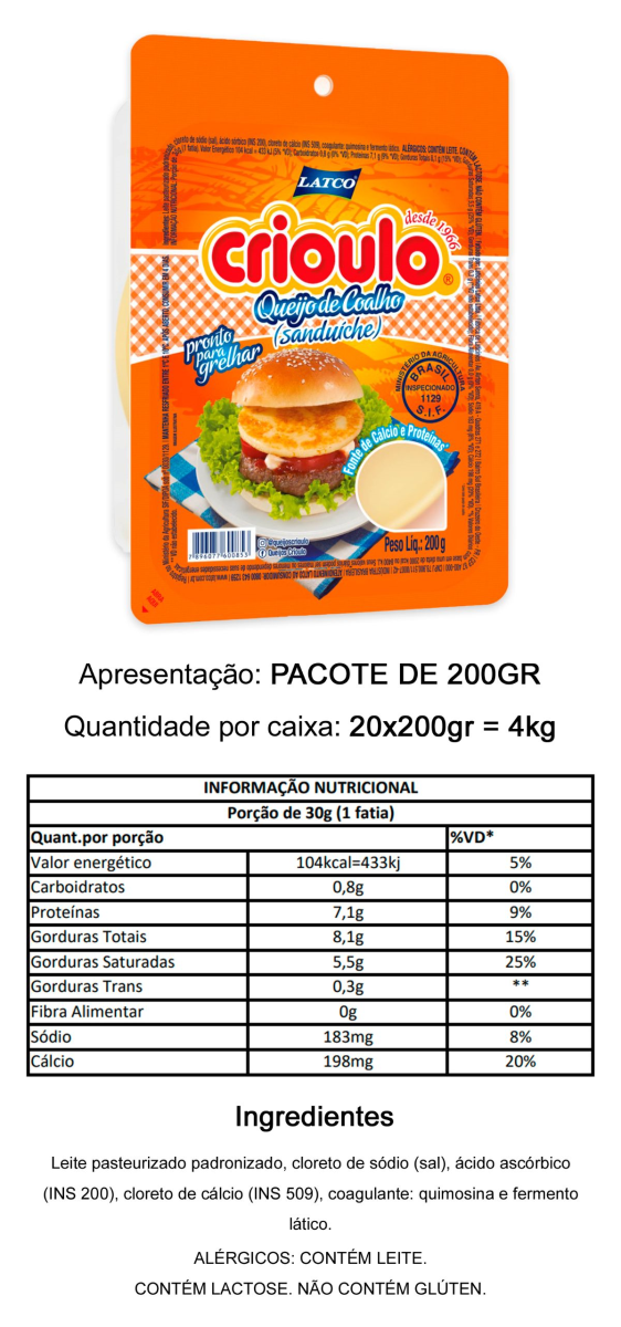 HTTP://WWW.LATCO.COM.BR/PRODUTOS-CRIOULO/CRIOULO/#QUEIJOS-DE-COALHO-CRIOULO-FORMA CAIXA COM 20PCT/ PCT 200GR COM 6 UNIDADES CADA