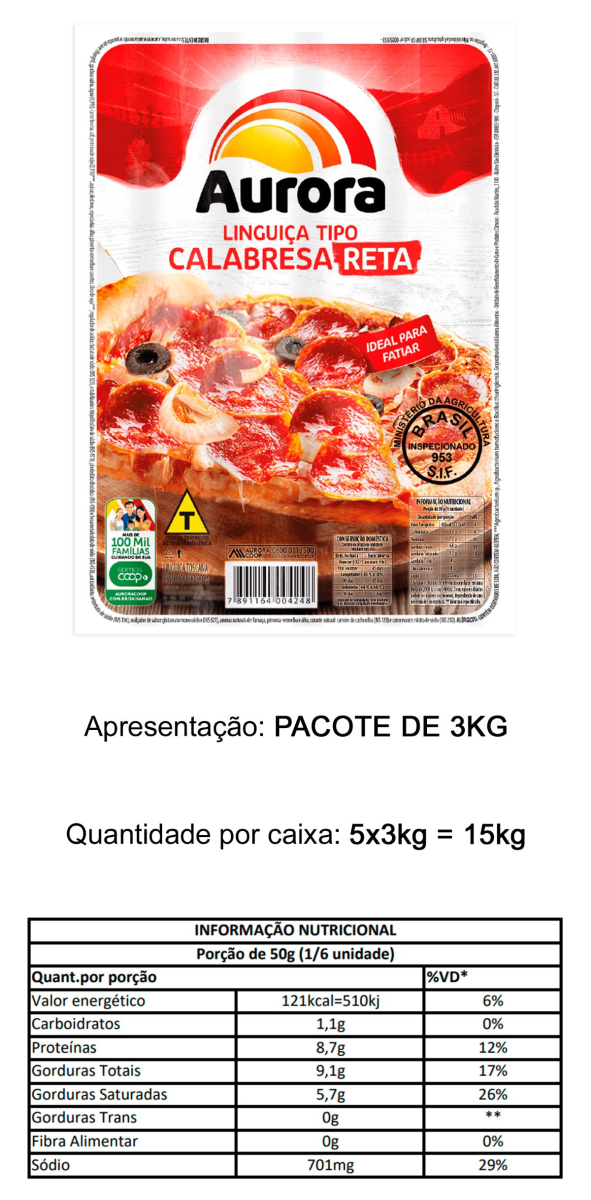 LINGUIÇA TIPO CALABRESA DEFUMADA RETA PODE ARMAZENAR EM LOCAL SECO E FRESCO ATÉ 25ºC HTTPS://WWW.AURORAALIMENTOS.COM.BR/