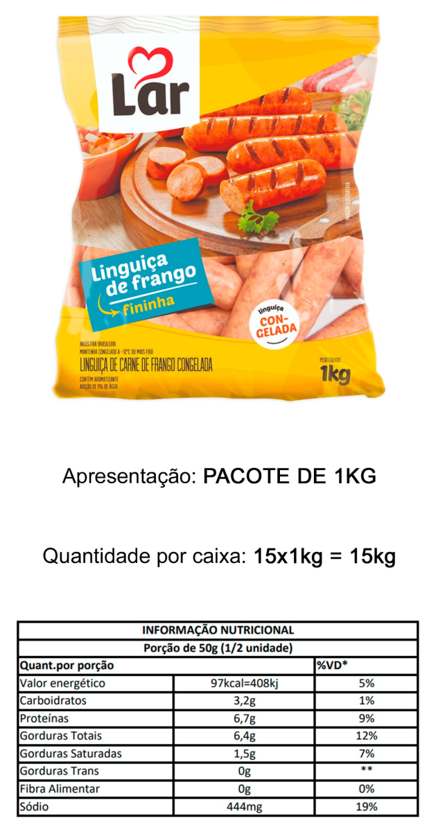 HTTPS://WWW.LAR.IND.BR/ LINGUIÇA DE CARNE DE FRANGO CONG 1KG. CX C/ 15KG ESTE ITEM NÃO CONTEM NENHUM INGREDIENTE PROVENIENTE DE SUINOS