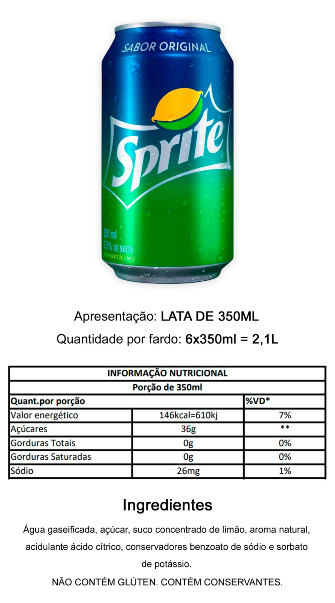 ÁGUA GASEIFICADA, SUCO DE LIMÃO, ACIDULANTE ÁCIDO CÍTRICO, AROMA NATURAL, EDULCORANTES CICLAMATO DE SÓDIO (72 MG) E SACARINA DE SÓDIO (11 MG) POR 100 ML, CONSERVADORES BENZOATO DE SÓDIO E SORBATO DE POTÁSSIO, ESTABILIZANTE CITRATO DE SÓDIO.