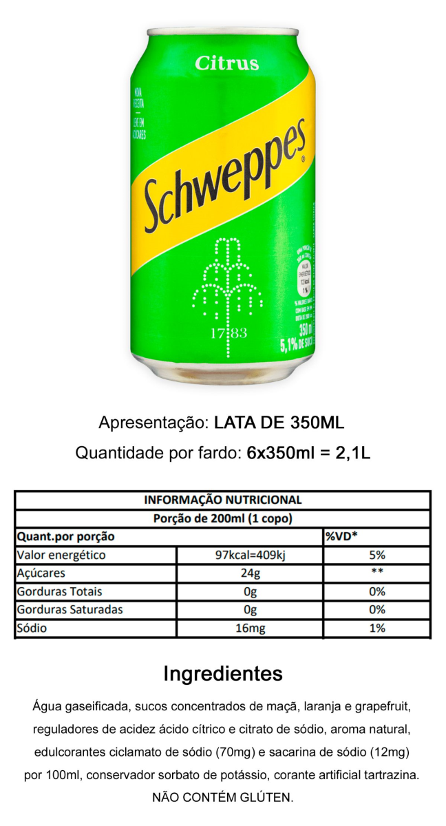 ÁGUA GASEIFICADA, SUCOS CONCENTRADOS DE MAÇÃ, LARANJA E GRAPEFRUIT, REGULADORES DE ACIDEZ ÁCIDO CÍTRICO E CITRATO DE SÓDIO, AROMA NATURAL, EDULCORANTES CICLAMATO DE SÓDIO (70 MG) E SACARINA DE SÓDIO (12 MG) POR 100 ML, CONSERVADOR SORBATO DE POTÁSSIO, CORANTE ARTIFICIAL TARTRAZINA