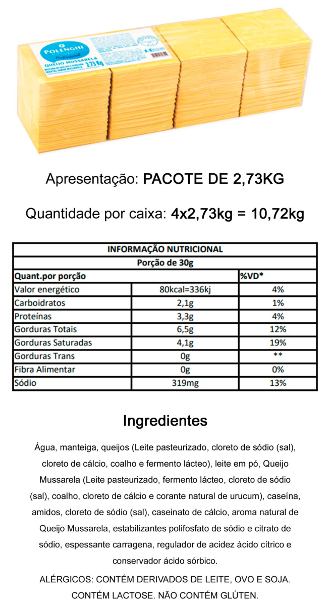 QUEIJO MUSSARELA FATIADA POLENGHI 2,73KG (QUEIJO PROCESSADO)