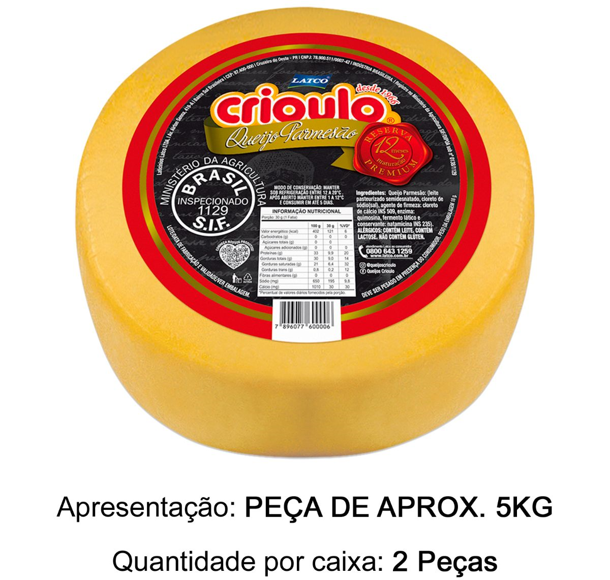 QUEIJO PARMESÃO PREMIUM CRIOULO 5KG (12 MESES DE MATURÇÃO)