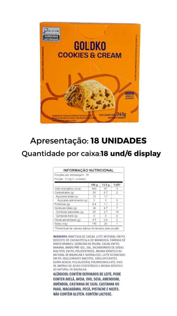BOMBOM COOKIES & CREAM GOLDKO 13G, ZERO AÇUCAR
