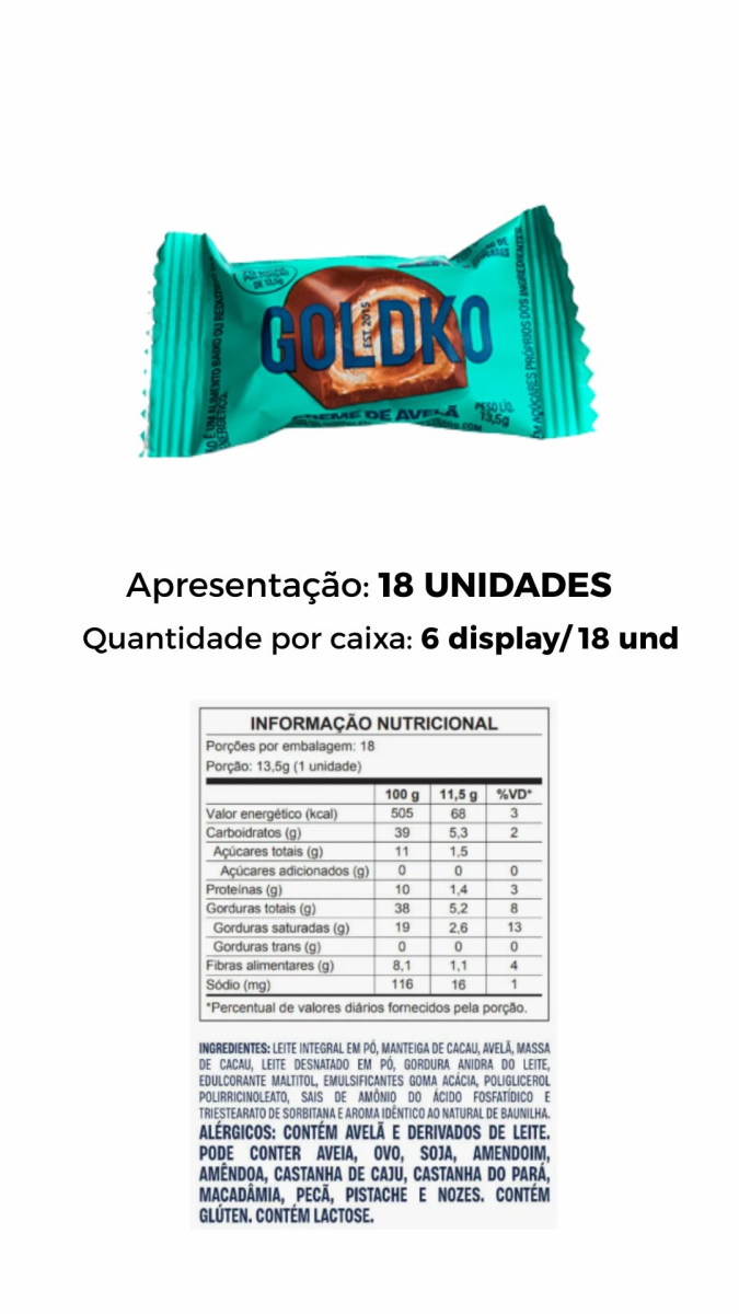 BOMBOM CREME DE AVELA GOLDKO 13G, ZERO AÇUCAR