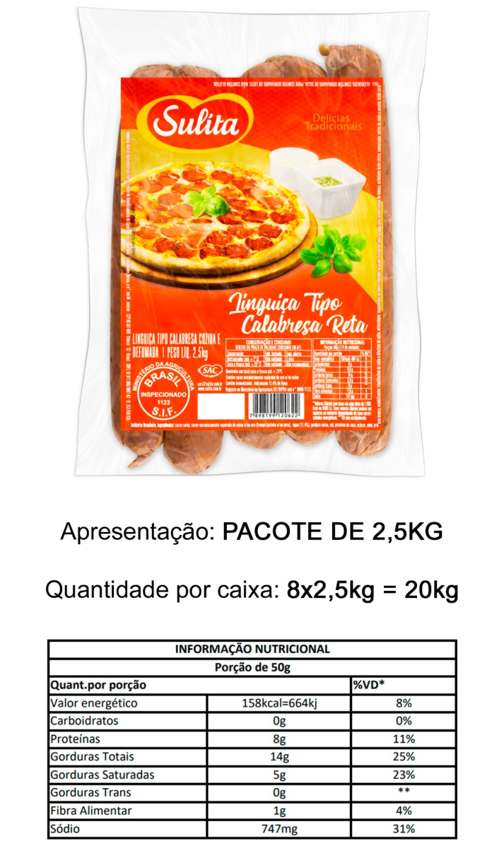 LINGÜIÇA TIPO CALABRESA RETA PODE ARMAZENAR EM LOCAL SECO E FRESCO ATÉ 25ºC COD.81002 - CX 15KG HTTPS://SULITA.COM.BR/