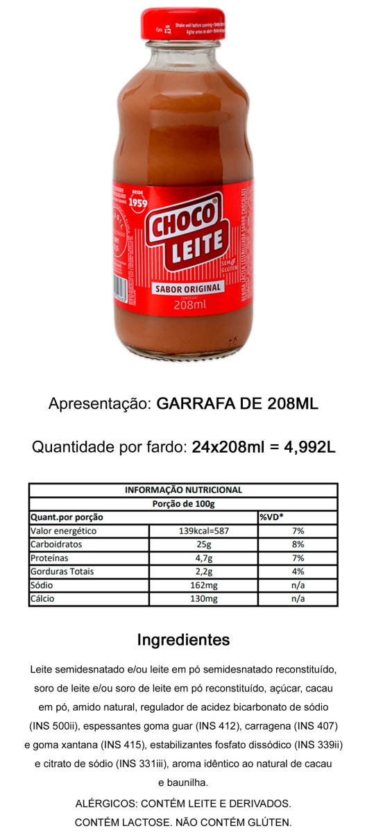 INGREDIENTES: LEITE SEMIDESNATADO E/OU LEITE EM PÓ SEMIDESNATADO RECONSTITUÍDO, SORO DE LEITE E/OU SORO DE LEITE EM PÓ RECONSTITUÍDO, AÇÚCAR, CACAU EM PÓ, AMIDO NATURAL, REGULADOR DE ACIDEZ BICARBONATO DE SÓDIO (INS 500II), ESPESSANTES GOMA GUAR (INS 412), CARRAGENA (INS 407) E GOMA XANTANA (INS 415), ESTABILIZANTES FOSFATO DISSÓDICO (INS 339II) E CITRATO DE SÓDIO (INS 331III), AROMA IDÊNTICO AO NATURAL DE CACAU E BAUNILHA. CONTÉM LACTOSE. ALÉRGICOS: CONTÉM LEITE E DERIVADOS. NÃO CONTÉM GLÚTEN. CHOCOLEITE FD C/24GARRAFA
